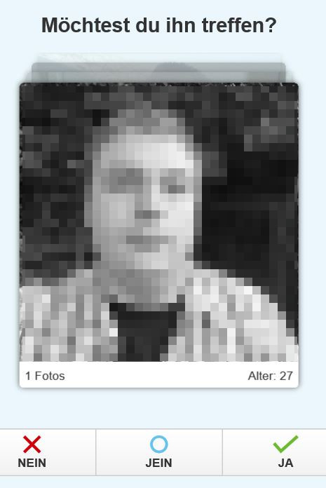 - Sie bekommen Profilfotos nacheinander zugespielt, klicken auf den roten Button mit einem X, den grünen Button mit einem Haken oder in der Mitte auf “JEIN”.