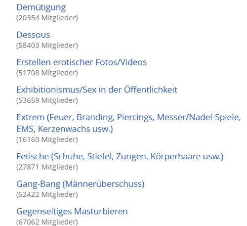 Die große Mitgliederkartei ist nach Ländern, Vorlieben und Konstellationen (mmw, wwm etc) sortiert. Natürlich werden dabei auch verschiedene sexuelle Vorlieben und Neigungen einbezogen.