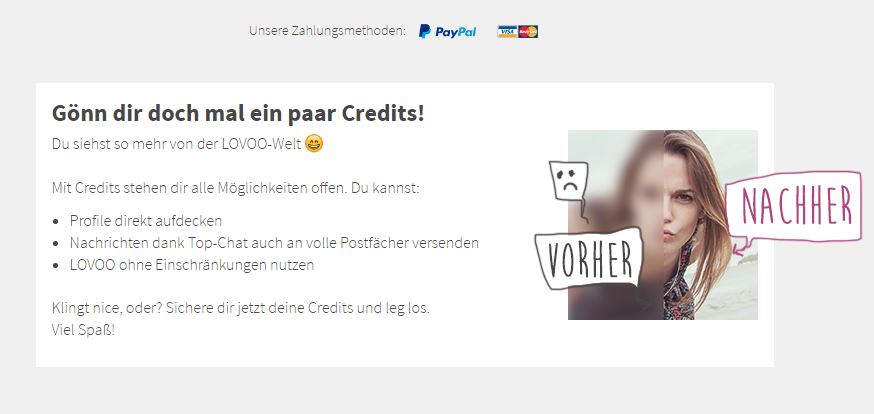 300 Credits bekommt man für um die 3 Euro. Bei den Lovoo Kosten für Credits handelt es sich um kein Abo. Vorteile durch Lovoo Credits