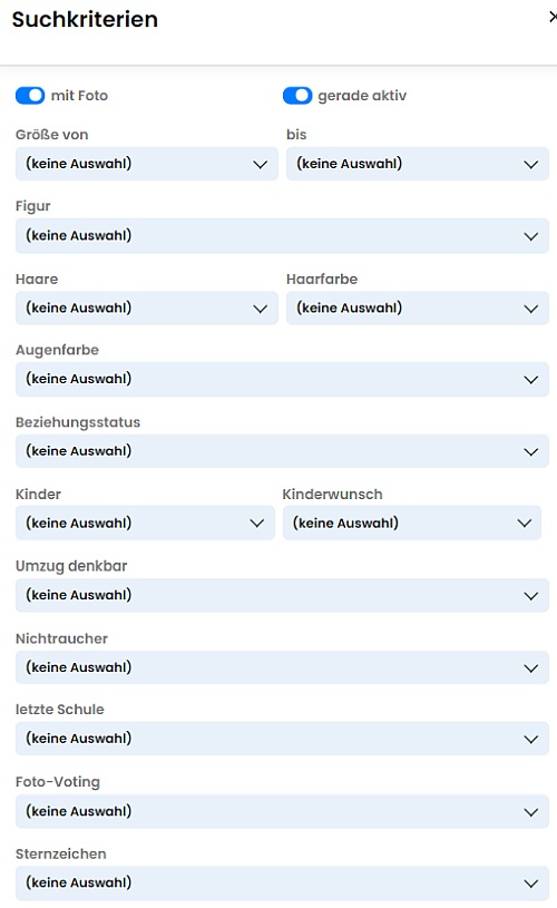 Standardmäßig definieren Sie die gesuchte Altersgruppe und Wohnort inkl. Umkreisangabe direkt nach Ihrem Finya de Login. Die Suchkriterien bietet jedoch eine Menge Möglichkeiten, die Suche nach einem Gratis-Flirt bei Finya weiter zu verfeinern.
