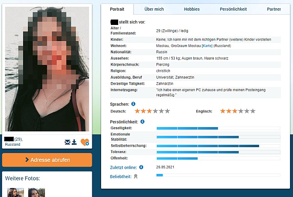 Zudem überprüft der Anbieter monatlich die Aktualität der Inserate der osteuropäischen Frauen. Diese werden pro Monat 1x kontaktiert, reagiert die Frau zweimal nicht auf die Kontaktversuche, wird ihre Anzeige gelöscht.