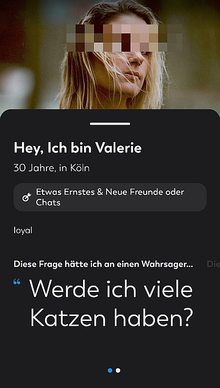 Zudem gibt es in der App “Profilfragen”, mit denen die eigene Persönlichkeit beschrieben werden kann. Dabei werden Ihnen Fragen wie bspw. folgende gestellt: