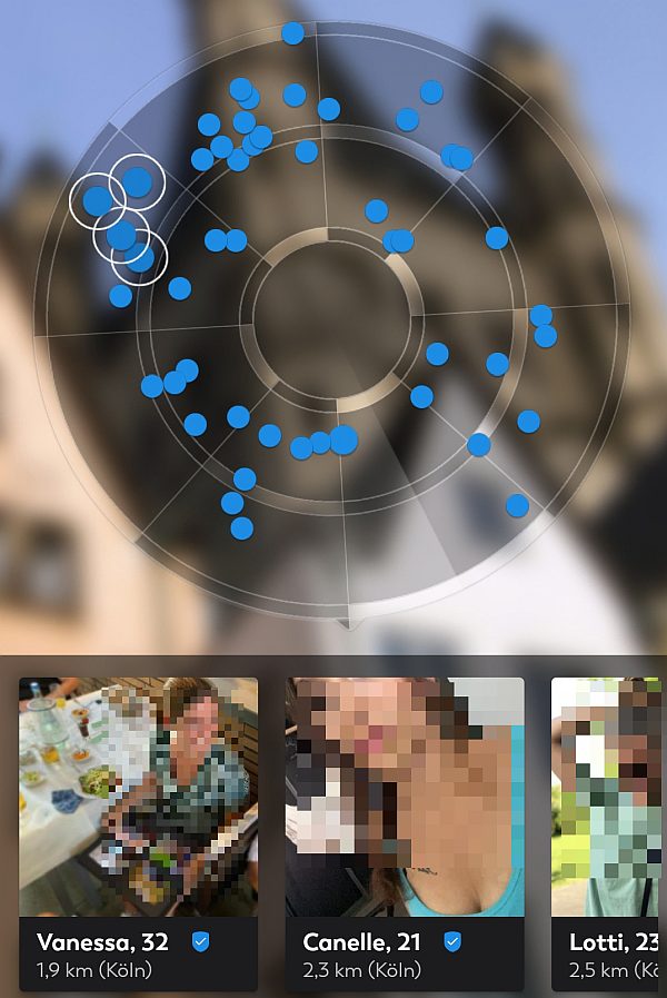 Mit einem Klick auf einen blauen Punkt im Radar oder unten im Profil-Karussell gelangen Sie direkt zum Profil, wenn Sie ein Foto interessant finden. Die Ansicht des Flirt-Radars können Sie im Übrigen auch ändern, dann haben Sie anstatt des Flirt-Radars eine Aufreihung der Lovoo-Nutzer in Ihrer Umgebung wie in einem Katalog.