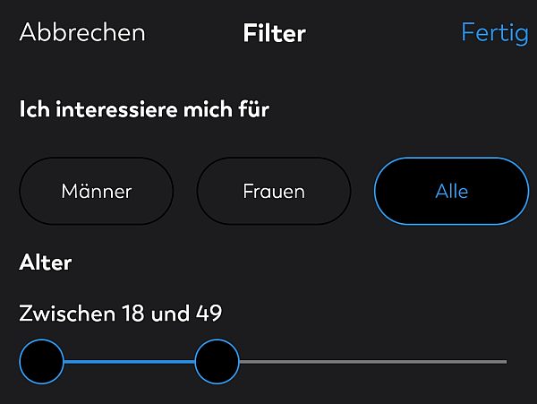 Sie können in der App nur eine Altersspanne eingeben sowie angeben, ob Sie männliche oder weibliche Nutzer oder alle sehen wollen.