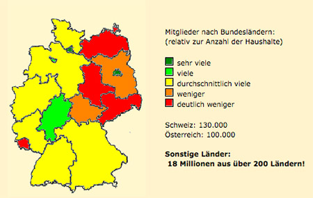 Darunter finden Sie 1,2 Mio. aussagekräftige, sprich aktive Profile. Der Löwenanteil entfällt auf Deutschland, aus Österreich sind etwa 100.000, aus der Schweiz 130.000 dabei. Karteileichen werden automatisch nach etwa 6 Monaten gelöscht.