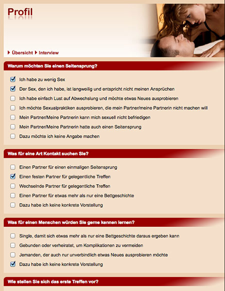 Die Anmeldung bei dem Portal geht ganz flott von der Hand und konzentriert sich im wesentlichen auf die Angaben zum Body, Lebensgewohnheiten und Beziehungsstatus bei Ihnen und beim gesuchten Seitensprungpartner.