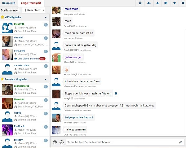 Der Chat steht allen Mitgliedern offen. Die Chaträume sind nach Städten und Bundesländern gegliedert – praktisch da es hier wesentlich um reale Sextreffs geht. Neben den offen Chaträumen, können Sie auch mit einzelnen Usern in einen 1:1-Chat wechseln.