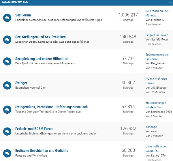 Das Erotik-Forum bietet Themen mit teils über 350.000 Beiträgen. Am beliebtesten sind “Bettgeflüster” und “Flirten und Kennenlernen”, mit Fokus auf Verführung, schnelle Dates und Sexkontakte.
