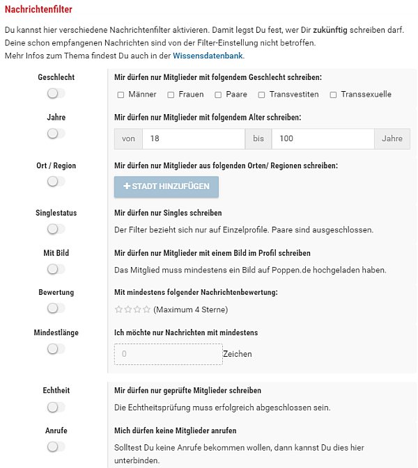 Als Basis-Mitglied haben Sie jeden Tag ein bestimmtes Kontingent an Freinachrichten an andere Nutzer. Diese Beschränkung hilft Poppen de dabei, übermäßigen Spam gut einzugrenzen. Wer ernsthaft Interesse an einem Sexdate hat, sollte jedoch über eine Premium-Mitgliedschaft nachdenken.