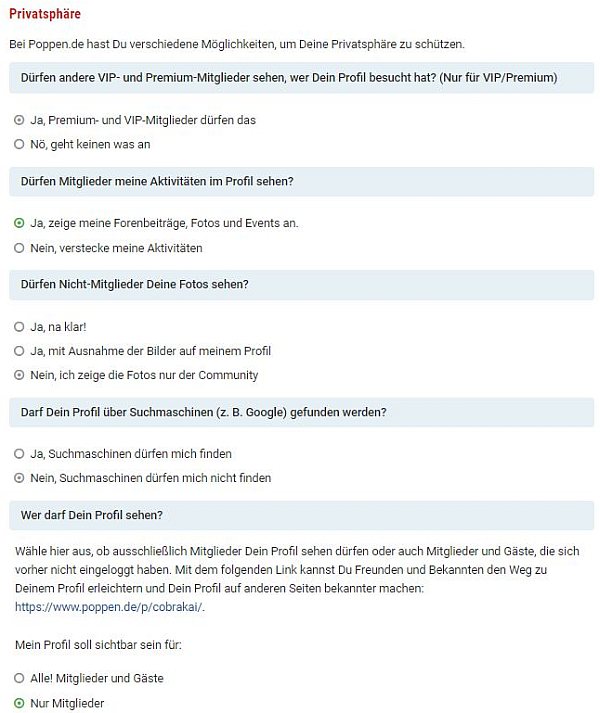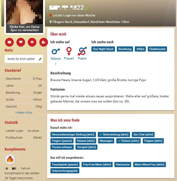 Männer und Frauen bei Poppen.de sind da etwas anders: Sie möchten sicher sein, dass Arbeitgeber, Nachbarn oder Verwandtschaft beim Surfen im Netz nicht zufällig auf ihr Sexdating-Profil stoßen. Deshalb können Mitglieder auf dieser Seite für erotische Abenteuer ihre Privatphäre gezielt steuern.
