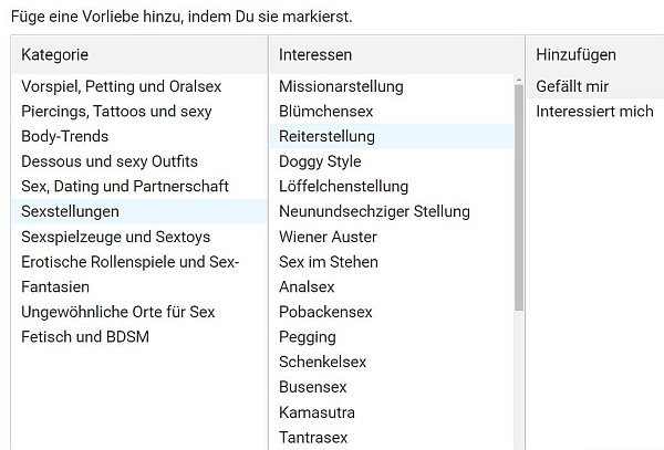 Diese Vorlieben-Liste wird unter dem Punkt “Was ich sexy finde” in Ihrem Profil angezeigt. Je detaillierter Sie hier sind, desto leichter finden Sie Gleichgesinnte, die sich von Ihrem Profil angesprochen fühlen.