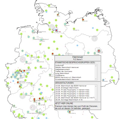 Über die Landkarte können Sie sich Fetisch-Events, BDSM-Stammtische etc. direkt in Ihrer Region anzeigen lassen. Vielleicht ist Ihnen der direkte Kontakt im ersten Schritt lieber. Der Punkt Sucht Begleitung liefert Ihnen dazu ein passendes Date.