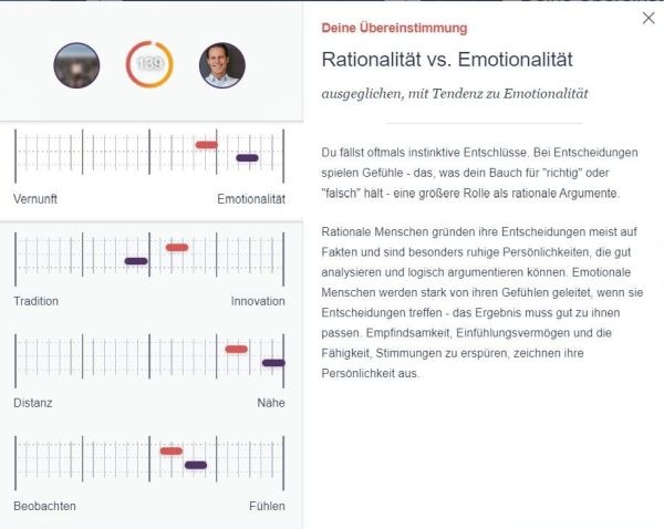 Der wissenschaftliche Persönlichkeitstest umfasst u.a. die Bereiche “Emotionalität oder Vernunft”, “Distanz oder Nähe”, “Tradition oder Innovation” sowie “Beobachten und Fühlen”. Bitte antworten Sie so ehrlich wie möglich bei diesem Test, die Antworten können im Nachhinein nicht mehr geändert werden.