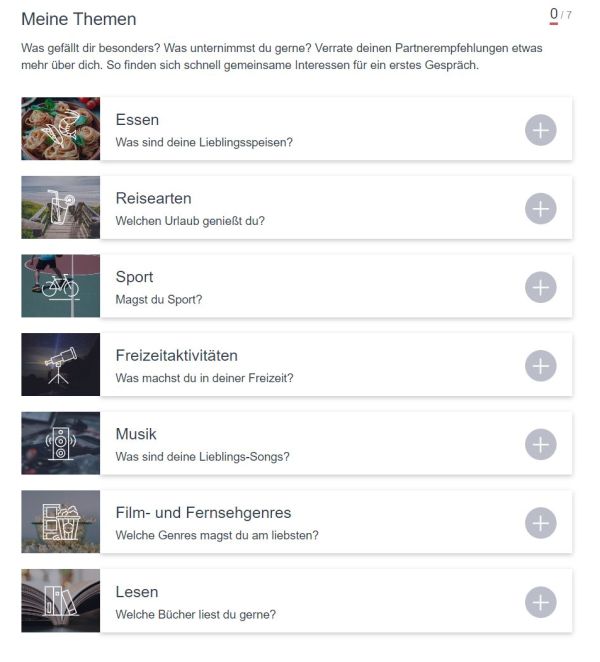 Wählen Sie drei Flirtfragen aus, die Interessenten beantworten können, um mit Ihnen ins Gespräch zu kommen. Und natürlich finden auch Sie auf anderen Mitglieder-Profilen diese Fragen und können sie nutzen.