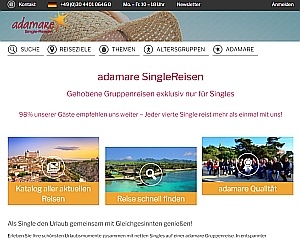 www.adamare-singlereisen.de100 000 jährlich50 : 50Die Gruppengröße liegt bei circa 20 Singles. Eine adamare-Singlereise ist geprägt von abwechslungsreichen gemeinsamen Unternehmungen einerseits und genügend Freizeit und Freiraum für jeden Einzelnen andererseits. Bei Ausflügen vor Ort werden einheimische Guides hinzugezogen.
